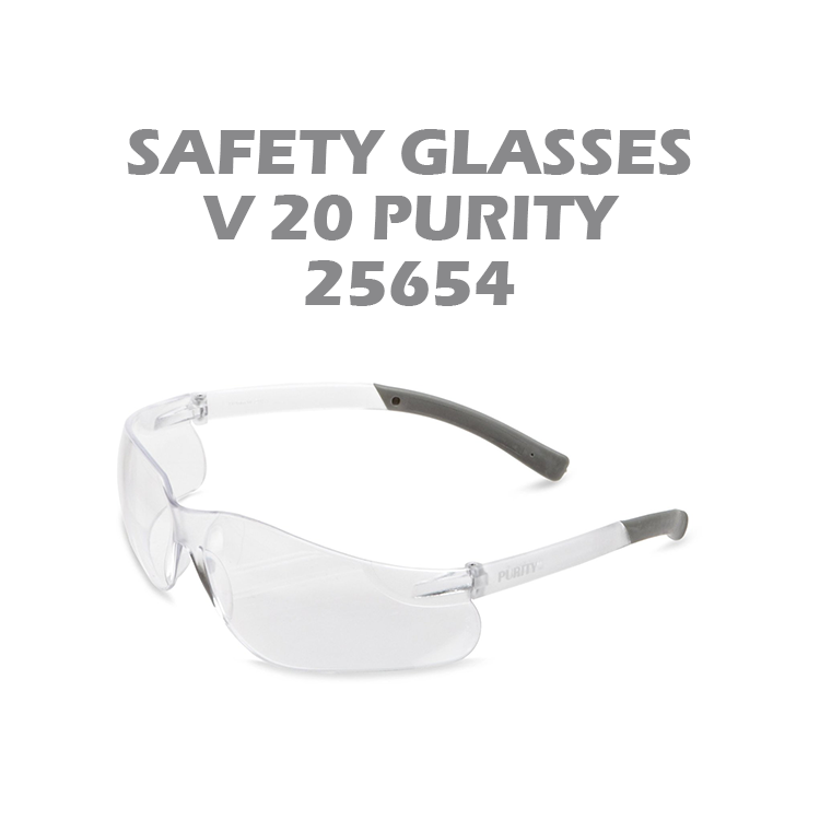 Safety glasses V20 Purity provide comfortable, stylish eye safety glasses at an affordable price. The Purity Safety Glasses have polycarbonate lenses that provide 99.9% UVA/ UVB/UVC protection to help prevent eye damage like cataracts, retinal damage, and other conditions that can cause temporary vision loss.